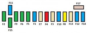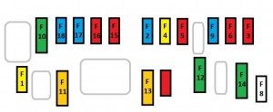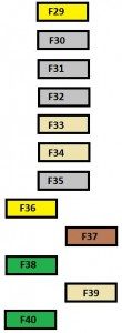 | F6 | 10 | Reflektory kierunkowe ksenonowe dwufunkcyjne, silnik korektora ustawienia reflektorów, zestyk sprzęgła, BCP (moduł przełączania zabezpieczenia |