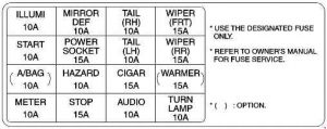 | IG 1 | 30 | CIGAR 10А, AUDIO 10A, IGCOIL 15A, TURN LAMP 10A, A/BAG 10A, WIPER(RR) 15A, WIPER(FRT) I5A, RELAY 10A, START 10A |