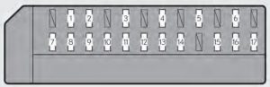 | 15 | RR ECU-IG | 10 | Elektryczny napęd pokrywy bagażnika, hamulec postojowy, ogranicznik siły naprężenia (tylny lewy), tylny panel sterowania, monitorowanie ciśnienia w ogumieniu |
