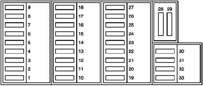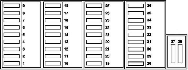 | 31 | Podgrzewana lewa/prawa dysza spryskiwacza szyby przedniej Podgrzewacz wody spryskiwacza szyby przedniej Blokada rozrusznika/przełącznik świateł wstecznych Automatyczna skrzynia biegów Pomocniczy przekaźnik wentylatora, I i II stopień (do 31.8.95) |
