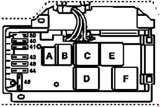 | 1 | Moduł sterujący przedniego podgrzewanego siedzenia (HS) Lewy przedni pas bezpieczeństwa wyposażony w cewkę elektromagnetyczną (do 31.5.98) Przedni prawy przedni pas bezpieczeństwa wyposażony w cewkę elektromagnetyczną (do 31.5.98) Przekaźnik regulacji siedzenia (od 1.6.98 do 31.5.99) Automatyczny pas bezpieczeństwa (od 1.6.99) |