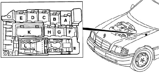 Główna skrzynka bezpiecznikowa w komorze silnikowej (1.12.94-31.5.97)